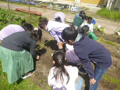 連休前にヒマワリ、オクラ、ダイズ、ホウセンカの種をじっくり観察して、3年生の畑にたねまきをしました。
