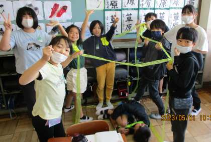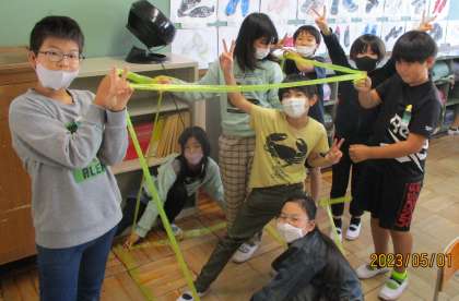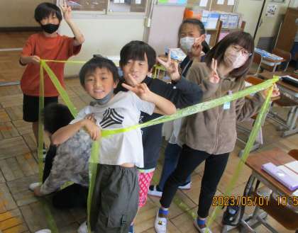 算数科「体積」の学習では、1㎥の量感をつかむために,テープを使い、1㎥の大きさをつくりました。「人が入れる!」「思っていたより大きい!(小さい!)」等、子どもたちは様々な反応をしていました。