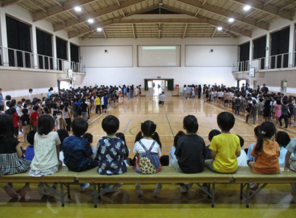 今日は1年生を迎える会がありました。2年生からのお迎えの言葉、3年生からのメダル、6年生が手を引いて入場、4・5年生が退場の歌の贈り物。