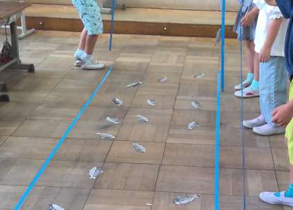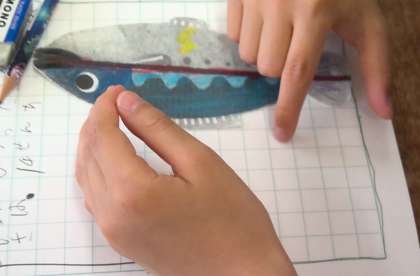 釣った魚の長さを伝えるために、「けしごむなんこぶん!」や、「ぼくの手より大きい!」と、色々な伝え方を話し合っています。