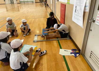 今日は体育館で、長座体前屈・反復横跳び・立ち幅跳び・上体おこし・握力をテストしました。お互いに声を掛け合ってがんばっていました。