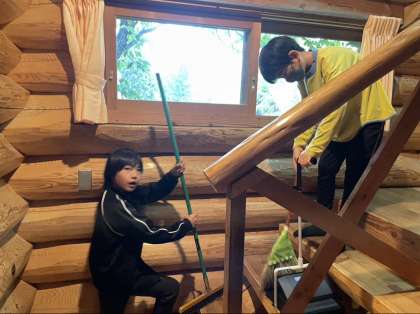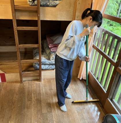 今は清掃と荷物整理をしています。「来た時よりも美しく」を合言葉に隅々まで掃除しています。各部屋での役割分担や、落とし物や忘れ物の確認等、声をかけ合いながら協力しています。