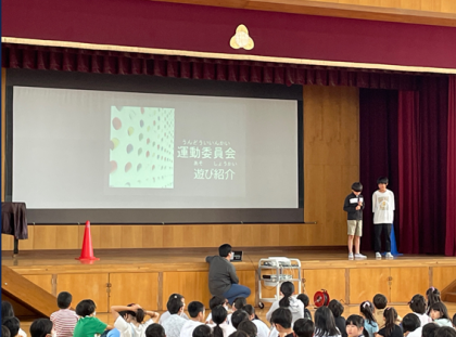 児童朝会では運動委員会が各学年に向けて遊びを紹介しました。