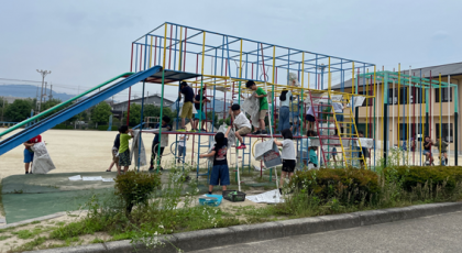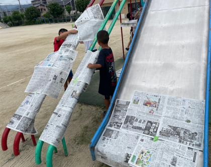 新聞紙でいろんなものをつつみました。教室で机や椅子をつつんだ後クラスのみんなで協力して総合遊具に挑戦しました。3点支持で体を支えながら協力してつつんでいきました。