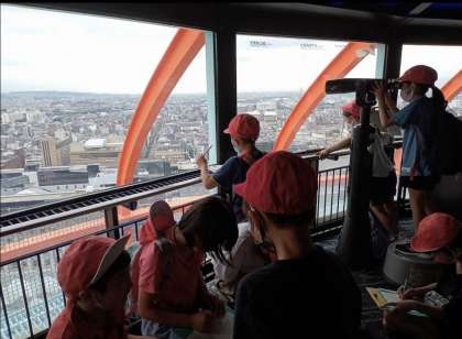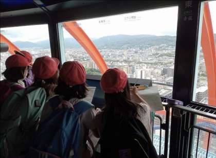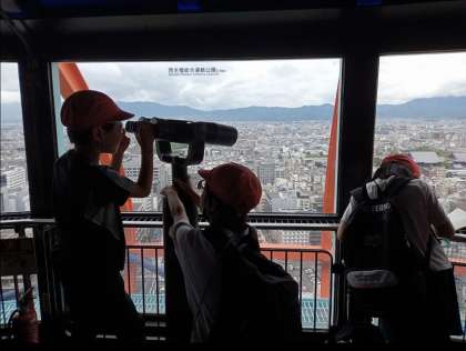 京都タワーの展望台から京都市内を一望しています。京都の北の方には山が広がっていることを確かめたり、学習したことを思い出したりしています。