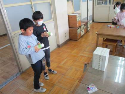今日は、前回作った、動く仕組みを利用した自分のおもちゃのバージョンアップに取り組みました。「もっとはやく動くようにしたい!」「もっと高くとばしたい!」という思いを実現させるために、ひとりひとり試行錯誤しながら取り組みました。友だち同士で、「ゴムの数を増やすといいよ!」「紙の部分をプラスチックにするといいよ!」などなど、お互いの工夫を交流する姿も見られました。