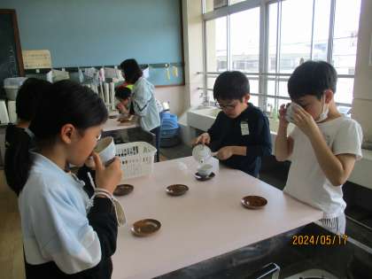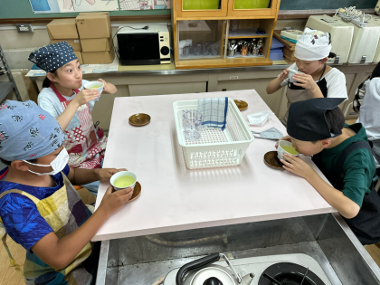 5年生から始まった家庭科の学習では、お家の中の仕事で自分でできることについて学習しています。今回は、急須でお茶を入れる学習を家庭科室で行いました。お湯の温度や、入れる時間をかえると思っていた以上に味が変わり、みんな驚いていました。
