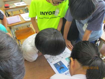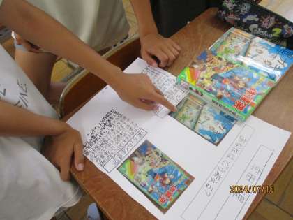 その後,お互いに作ったカードを読み合って,夏休みに借りる本を選びました。紹介した本を友だちが借りていくことがうれしかったようです。