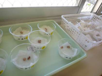 理科では、インゲンの種子の発芽にはどんな条件が必要なのかを考えて実験しています。