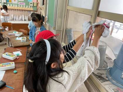 型をとった後には、ぞうきんで汚れをとって片づけまではなまるの子どもたちでした。