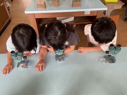 理科室には、どんな道具があるのかを観察しました。そして、双眼実体顕微鏡でメダカの卵を見たり、人の体の中のつくりを見たりしました。