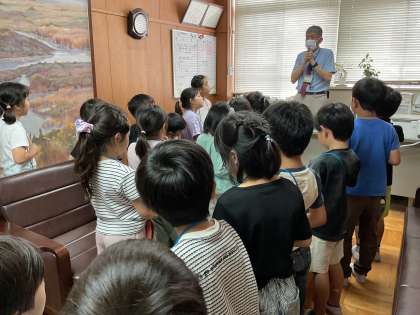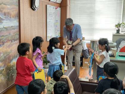 先週のがっこうたんけんで校長室へ行きました。校長先生へインタビュー後、特別に校長室のいすに座らせてもらいました。みんな嬉しそうに笑顔で座っていました。