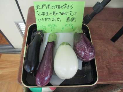 今朝、北門前の畑の方から、「子ども達に見せてあげて」と、4種類(よく見かけるナス、青い丸ナス、白い丸ナス、イタリア系のナス)のナスをいただきました。 感謝!