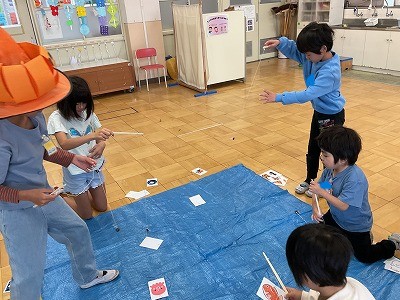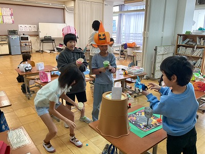 1組でハロウィンパーティーをしました。ハロウィン魚釣りやハロウィン玉入れなど楽しいゲームをたくさんした後、かぼちゃのぼうしをかぶって職員室へ。「トリックオアトリート!」と言って、教職員から(紙の)お菓子をもらいました。とても楽しい一日でした。
