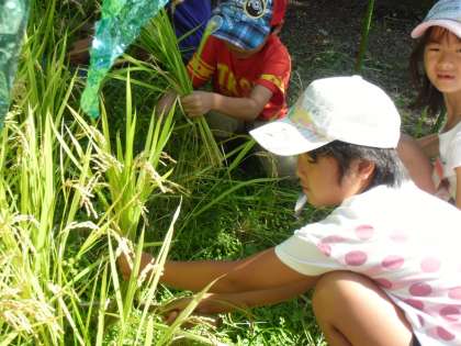桂徳小学校の小さな田んぼの稲は16日の台風にもめげず,実りの秋を迎えました。そこで2年生みんなで稲刈りをしました。もちろんスクールヘルパーさんにお手伝いいただいて。