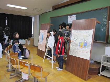 自分たちが探究してきたことをどのようにまとめたら,たくさんの人に伝わるかを考えそれぞれのブースを設置しました。保護者の方や6年生の子どもたちも参加してくれて,5年生の子どもたちは『命を守る』方法を一生懸命伝えていました。