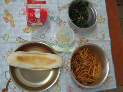 給食が始まりました。今日のメニューは、スパゲッティのミートソース煮、ほうれんそうのソティ、小型コッペパン、りんごゼリー、牛乳です。1年生は初めての給食でした。とてもおいしくいただきました。