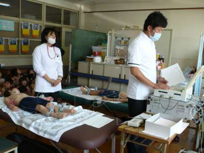 5月8日に1年生を対象に心電図検査を行いました。小学校では6年間で1回のみ1年生時に実施します。心臓に病気はないか,きちんと動いているかを心電図検査で調べます。