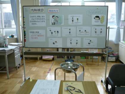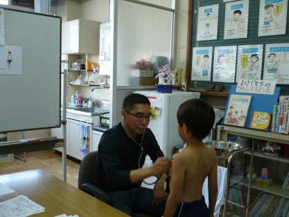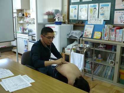 学校医の岡田先生に学年毎に内科検診をしていただいています。聴診器をあてて心臓や肺の様子を診ていただくとともに皮膚や背骨の状態もひとりひとり丁寧に診ていただいています。