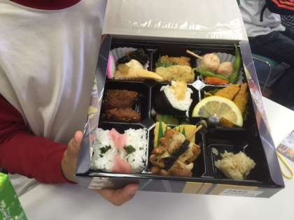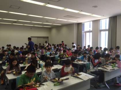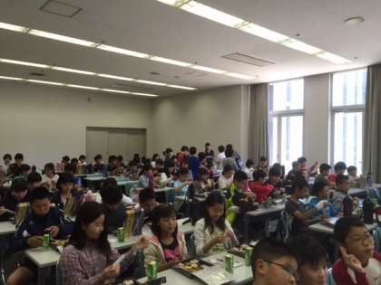 午前中の見学を終えてホールでお昼ご飯のお弁当を食べました。名古屋は晴天で暑いぐらいです。