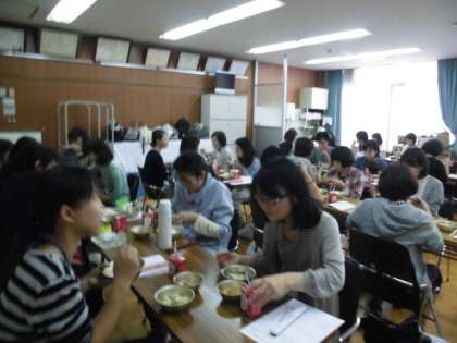 17日に給食試食会がありました。献立は,「ごはん・牛乳・鶏肉ととピーマンのごまいため・かきたま汁」でした。増田栄養教諭の給食についてのお話の後,1年生の子供たちの給食準備の様子を見ました。実際に試食をした保護者の方からは,「やさしい味でおいしかったです」などの感想がありました。全体を通して「給食当番さんが一生懸命に楽しそうにしていてほほえましかったです」「もりもり食べていたので家とは違う面を見ることができました」「子どもの体をつくる大切な食事について考える機会になりました」などの感想がありました。