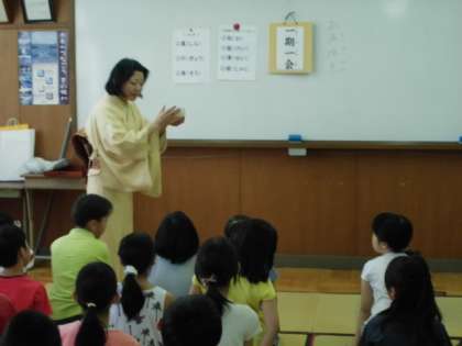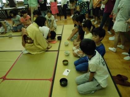 地域の女性会の方にお世話になりまして今年度一回目の茶道教室がありました。50名の子どもたちが参加登録する人気の講座です。3年生ははじめての参加となります。お辞儀の仕方や「和敬清寂」の言葉などについて学んだあと実際にお茶とお菓子をいただきました。子どもは少し緊張した面持ちでしたが楽しそうにお茶を頂いていました。