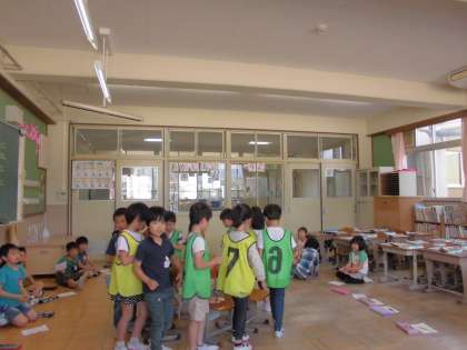 いすとりをして,緑と黄色がいくつといくつになるのか考えています。