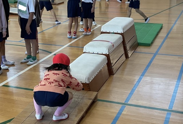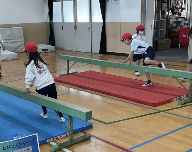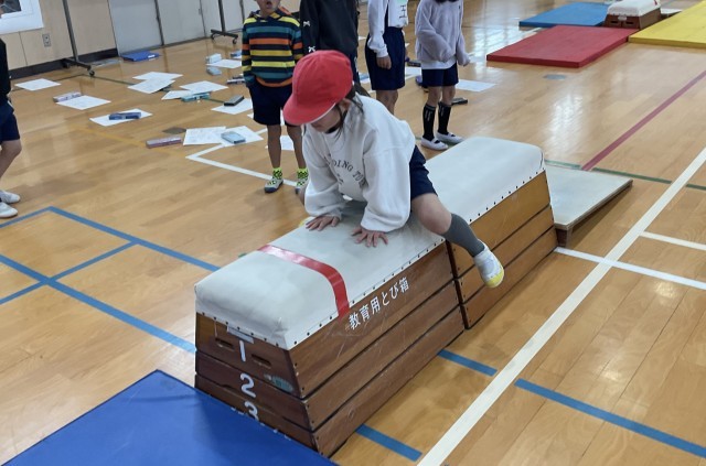 体育科の学習でとびばこあそびをしています。跳び越すだけでなく、跳び乗ったり跳び下りたりして楽しんでいます。