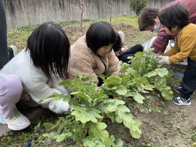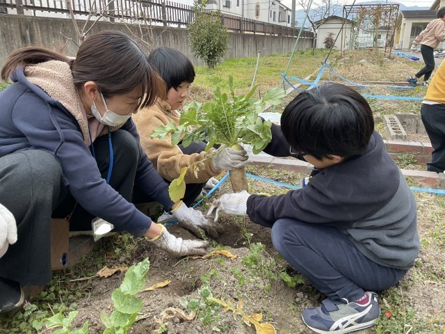 12月に植えた大根とかぶを収穫しました。大きいものから小さいものまでたくさんできました。クッキングで少し使用し、残りは分けて持ち帰っています。