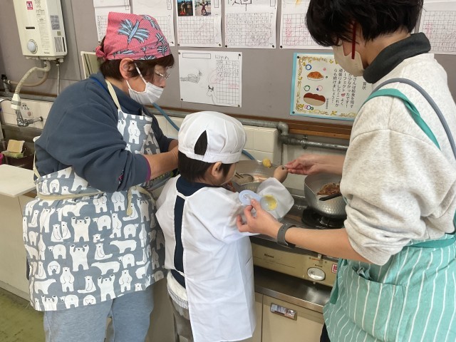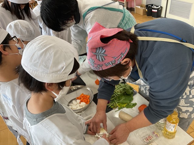 1組の畑でとれた大根やかぶを使って、白味噌のお雑煮を作りました。こんぶやかつおで出汁をとるところから始めました。お出汁のいいにおいや味にもびっくり。お雑煮もお正月の白味噌の味を味わいました。ピーラーや包丁を使って野菜を切ることにも挑戦しました。普段苦手なものがある子もすすんで食べ、おかわりする子もたくさんいました。