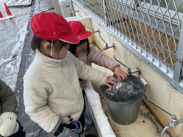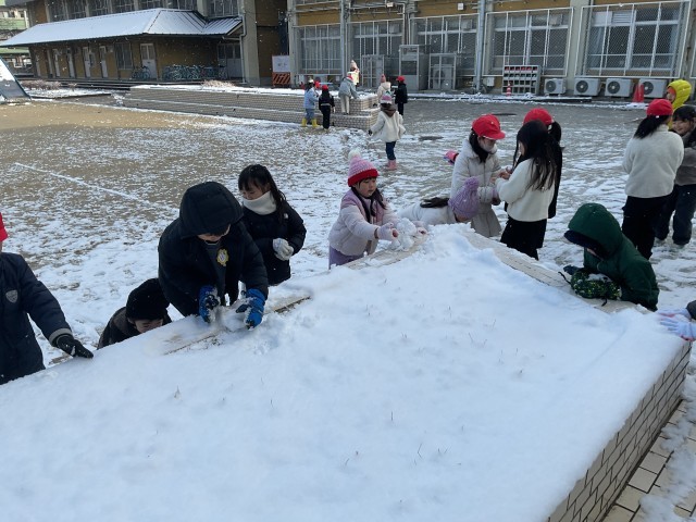 桂徳小学校に雪が積もりました。ふゆとともだちの学習で雪遊びをしました。雪をぎゅっとすると硬くなることや水の上に雪を落として溶けていく様子など遊ぶ中でいろいろなことを学びました。