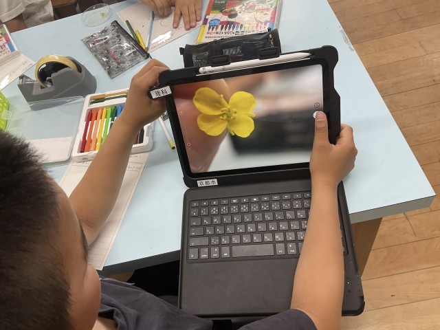 理科の学習でカラシナの花の観察をしました。花の中には「おしべ」や「めしべ」があることを学びました。