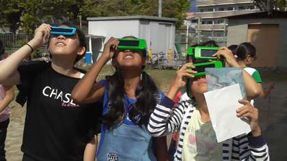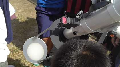 6年生では「月と太陽」の学習をしています。今日は、太陽の観察です。遮光メガネでは黒点まで見えません。望遠鏡につないだ太陽投影板で黒い影を確認、そして、遮光フィルター付きの望遠鏡をのぞくと・・・!? 小さく1対ですが、くっきりと黒点が見えました!