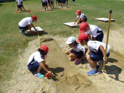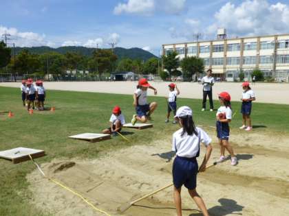 比較的短い助走距離から片足で踏み切ってどこまで遠くへ跳べるかに挑戦しています。みんなで役割を交代し合って,自分たちで学習を進めます。