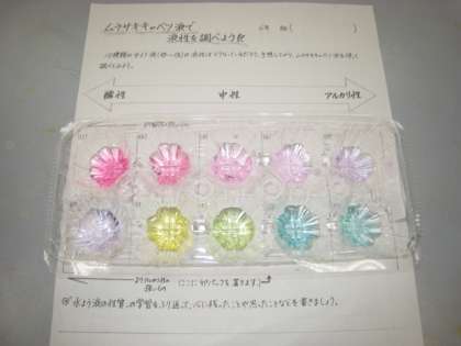 ムラサキキャベツ液を使って,10種類の水溶液の性質を調べました。リトマス試験紙で調べるのとは違って,きれいな色の変化に子どもたちは驚いていました。