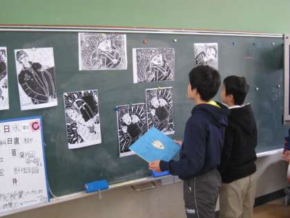 6年間お世話になったランドセルを題材にして,木版画に取り組んでいます。時には,友だちの作品を参考にしながら,慎重に彫り進めています。