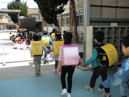 1日目のお帰りです。方面ごとに分かれて,集団下校です。明日も元気で来てね。