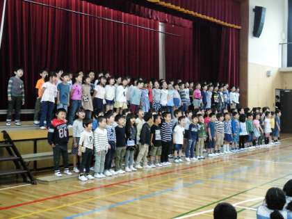 最後は1年生から「よろしくね」のお礼のことばと歌です。「あおいそらにえをかこう」と元気に歌いました。
