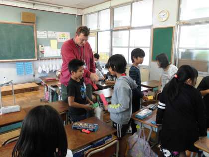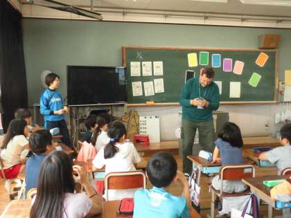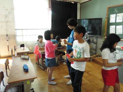 4年生の外国語活動が始まりました。ALTのロバート先生に、ほしい色の画用紙をリクエストしてネームカードをつくり、交換しながら自分のを見つけるゲームをしました。年間35時間ですが、英語に慣れ親しみ、コミュニケーション能力の素地を養っていきます。