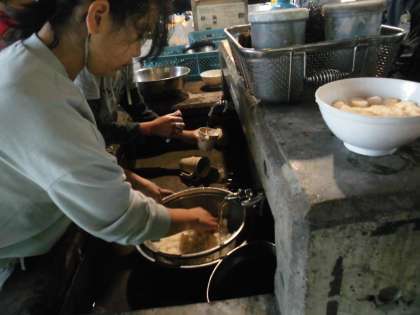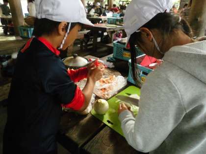 初めに調理器具や食器をすべて洗います。食材を切ります。人参・玉ねぎ・白菜・ねぎです。協力する力の見せ所です。