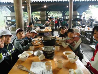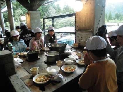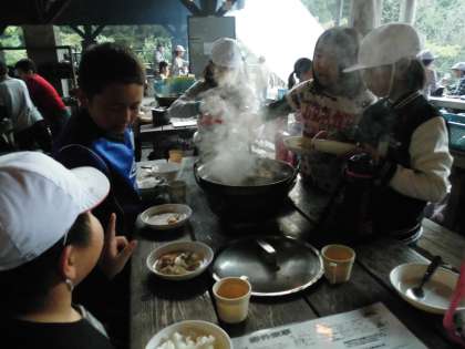 みんなで作ると不思議においしい鶏すき煮と白ごはん。ちょっとおかゆもどきもあったりして・・・。でもおいしいんです。