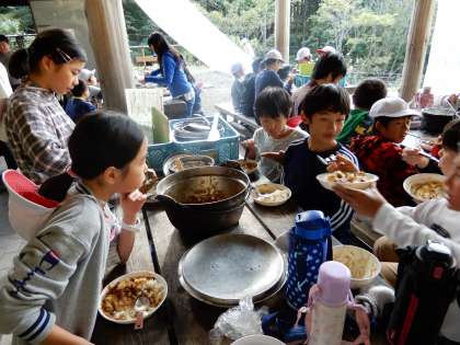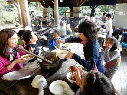 カレー作りはどのグループも大成功でした。お腹一杯カレーを食べました。本当においしかったです。準備から後片付けまで手際よく進んだため、時間が少しあまり、フリータイムができました。冒険の森で遊びました。