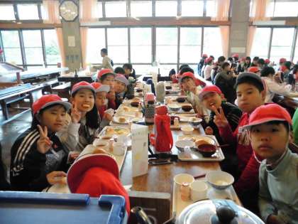 朝ごはんです。昨日は食堂の方に食欲旺盛ですねと言われた子どもたちです。