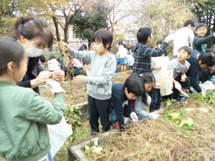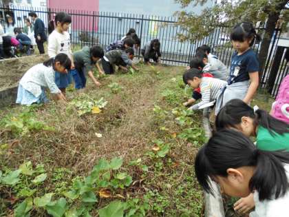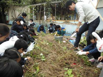 育ててきたサツマイモ掘りをしました。おいもを傷つけないように,スコップや手でやさしく優しく掘っていきました。