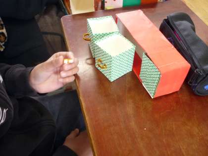 今日は,「不用になった物を生かそう」と,給食の牛乳パックを使って生活に役立つ物を作りました。