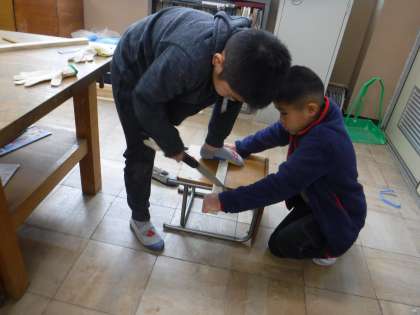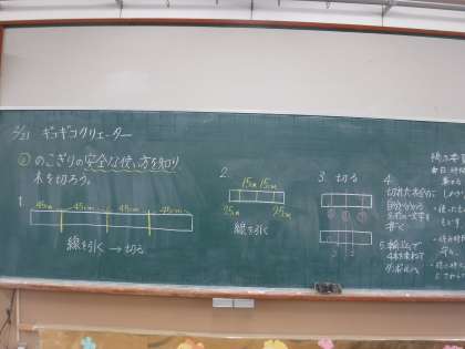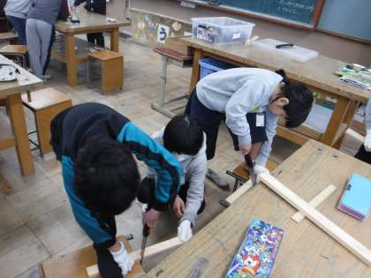 図工で,フォトフレームを作っています。180cmの木をのこぎりでギコギコ切って,決められた長さに揃えます。なかなか手際よく,切ることができました。木切れを組み合わせて完成させていきます。
