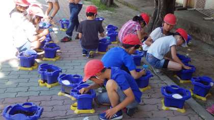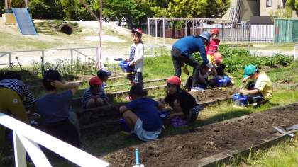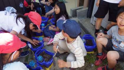 自分の植木鉢に土を入れ,肥料をまいて,そうっとホウセンカのたねに土をかぶせました。ちっちゃいたね,見失いそうなたねですが,これからきれいなホウセンカが咲くのを期待して・・・。