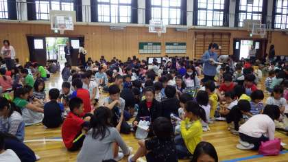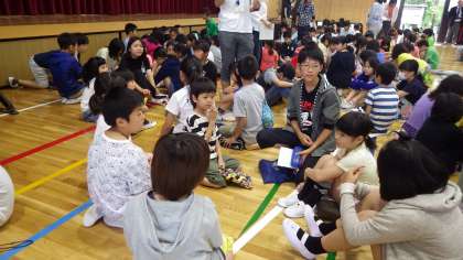 初めての児童集会は,自己紹介からです。グループのリーダーの6年生を中心に円になり,カードに名前を書きました。体育館はいっぱいですが上手に円になれました。