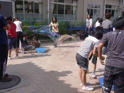 科学クラブで,大きなシャボン玉を作りました。