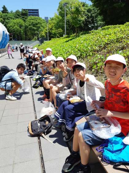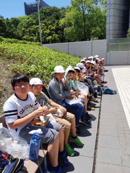 晴天で外は暑いです。日陰を探しながら座って食べたグループもあります。